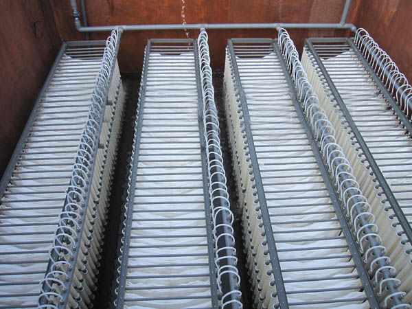 當(dāng)有足夠數(shù)量的有機營養(yǎng)物、礦物鹽和溶解氧時,微生物在填料的表面繁殖,逐步形成畫膜。由于擴散作用,氧和營養(yǎng)物質(zhì)通過膜供微生物吸收利用。當(dāng)膜長到一定厚度就會妨礙這種擴散,水中的氧和營養(yǎng)物質(zhì)不能通到內(nèi)層,生物膜開始分層,表層是好氧層。面內(nèi)層由于缺氧形成厭氧層。新形成的厭氧層內(nèi),好氧菌死亡溶解,成為兼性厭氧菌和厭氧菌的營養(yǎng)。當(dāng)內(nèi)層膜營養(yǎng)耗盡,厭氧微生物也大量死亡溶解,于是生物膜內(nèi)層不能支撐表面的生物群體,大塊的生物膜脫落。生物膜脫落而造成的更新面又會形成新的生物膜。另外少量的生物和一些小塊生物膜,由于水的沖刷或氣泡振動,不斷離開生物膜進人水中,這就是膜的脫落和更新。膜的脫落和更新對生物膜的活性有積極的作用,可以使生物膜保持穩(wěn)定的生物活性。脫落的膜沉淀后被排出系統(tǒng)。脫落和更新對水質(zhì)也有一定的影響,增加了水的濁度。